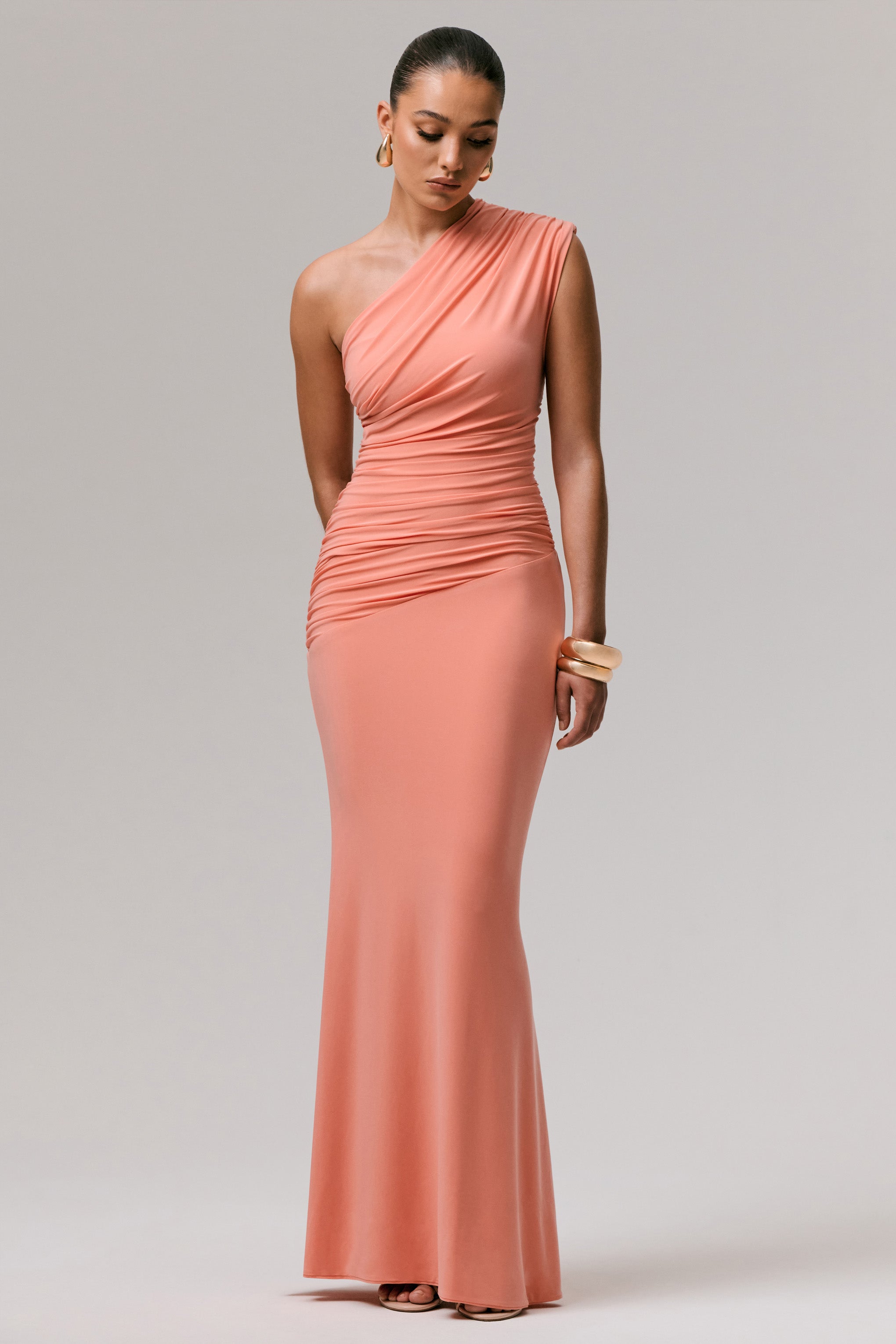 Own the room in Mardi, a sculpting silhouette made to flatter. Crafted in our premium stretch jersey, in this coral hued maxi you will make an entrance. Designed with a modern, asymmetric neckline that delicately displays your decolletage whilst adding chic structure. Finished with expertly placed ruched detailing, for the ultimate figure flattering finish, in this gown you will look sleek and sculpted. Pair with luxe heels and a glamorous up-do to finish the look.