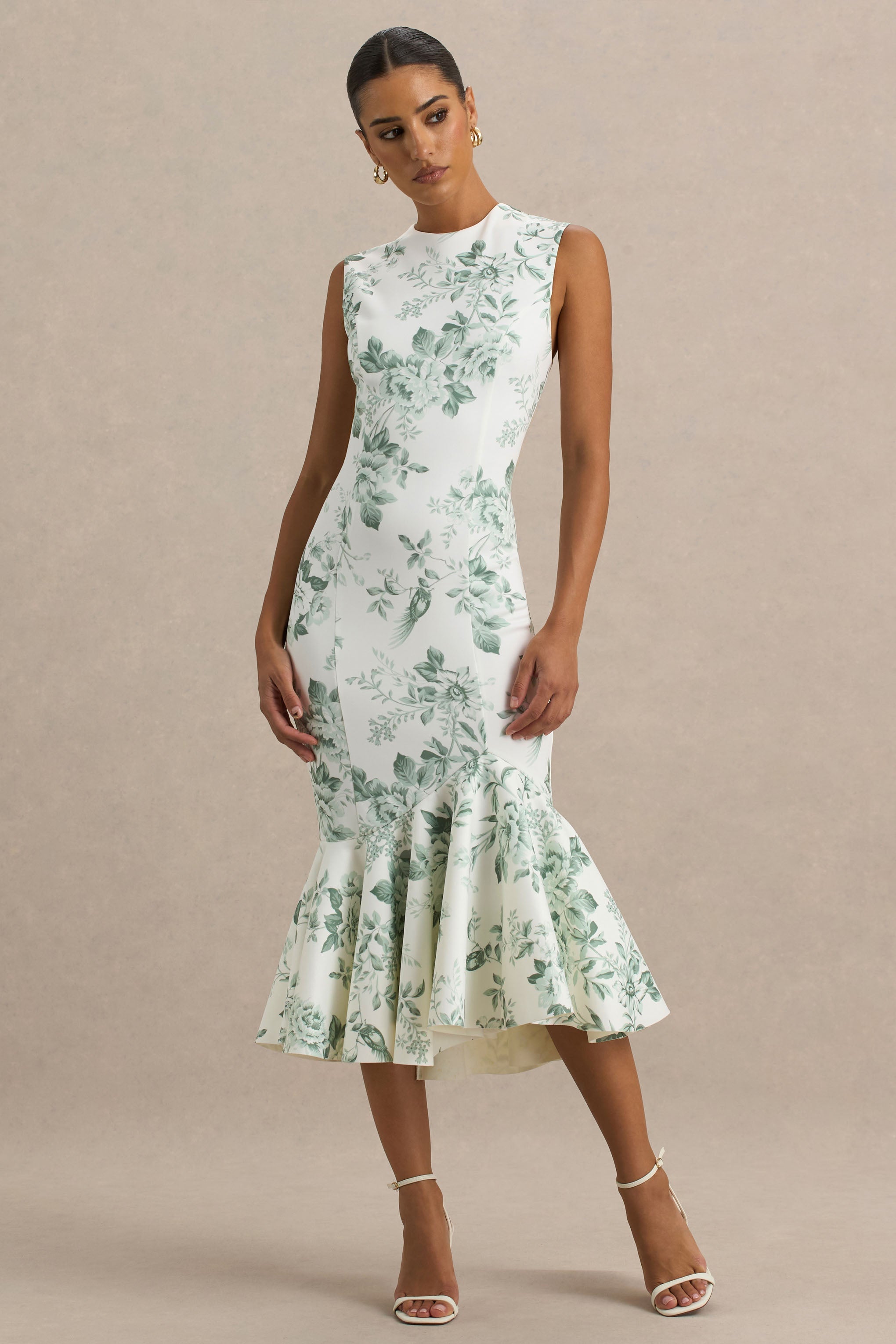 Turn heads in Priceless, a statement-making piece that defines modern glamour. Designed in a a delicate green porcelain print of our premium scuba crepe fabric, this midi dress contours your figure with effortless elegance. The high neckline adds a touch of sophistication, while the fishtail silhouette cascades into a ruffled hemline for maximum impact. Priceless is perfect for occasions that call for a little extra.