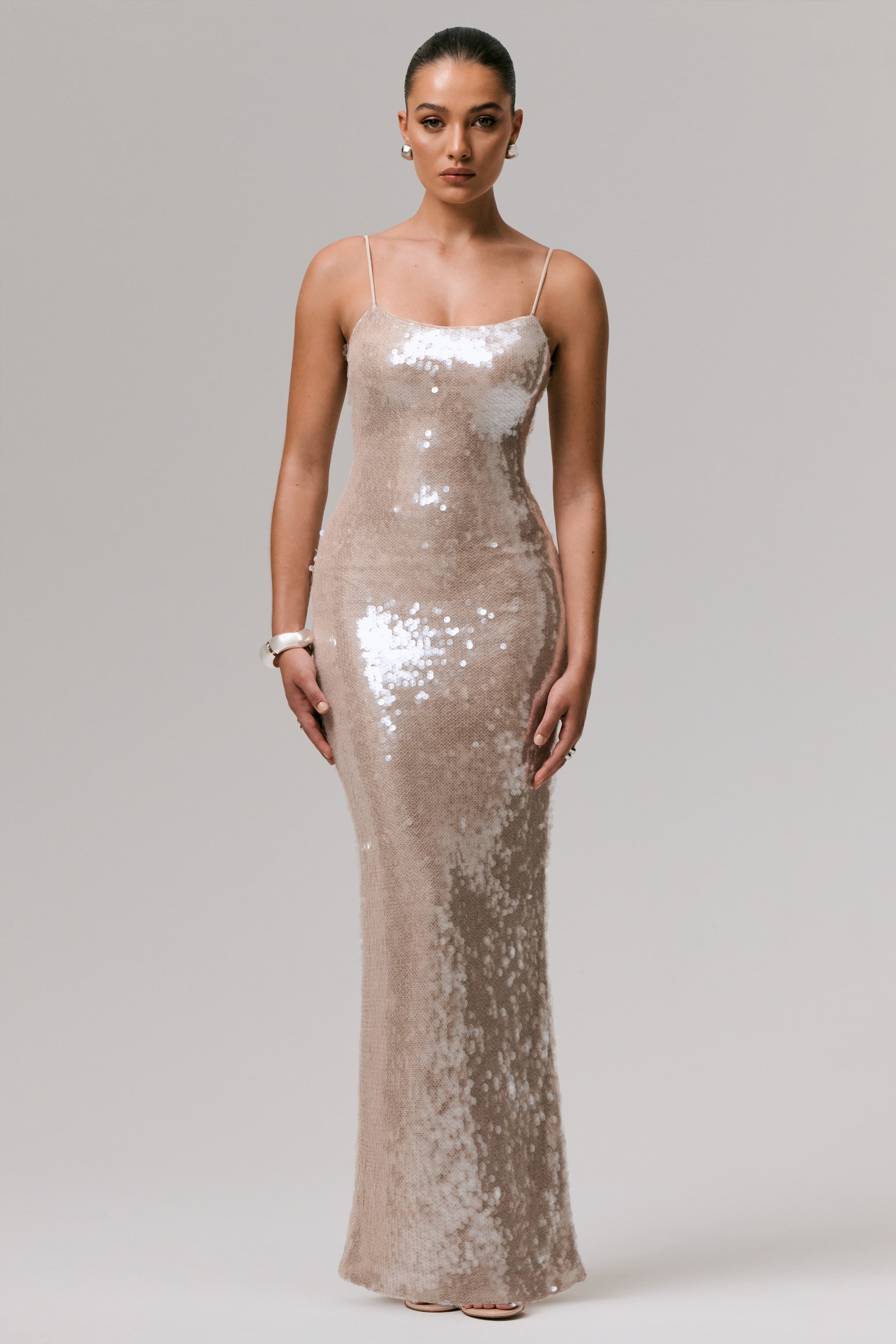 Dripping in decadence, Vermont is your go-to for making an unforgettable entrance. Crafted from our premium net-based sequin in an ethereal nude hue, this maxi dress was designed to captivate. The figure-skimming silhouette is framed by a timeless square neckline and delicate adjustable cami straps, offering a custom fit that flatters from every angle. A sultry centre-back split adds just the right touch of drama, allowing this piece to move with grace and elegance. Whether it's a black-tie affair or a champagne-soaked celebration, Vermont will steal the spotlight.